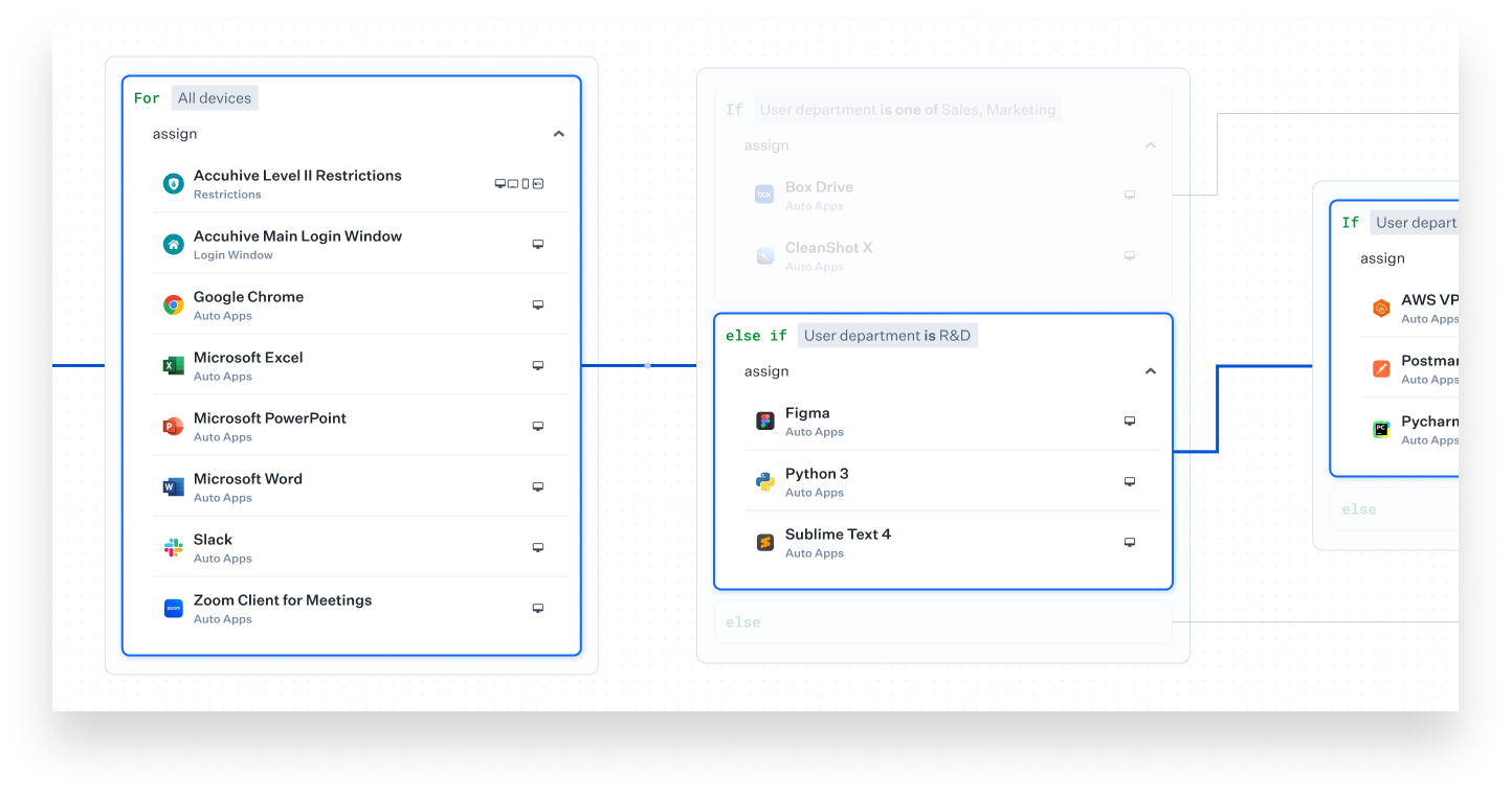 Like Classic Blueprints, Assignment Maps are collections of Library Items that are deployed to specified groups of devices. Unlike Classic Blueprints, Assignment Maps consist of conditional blocks—groups of if/else conditions that can evaluate user and device-specific data. Within those blocks, assignment nodes determine which apps, settings, and other configurations will be deployed to the devices and users that meet the chosen criteria. Assignment Maps can accommodate common deployment scenarios, including scoping by user location, department, or even device-specific identifiers such as asset tags.