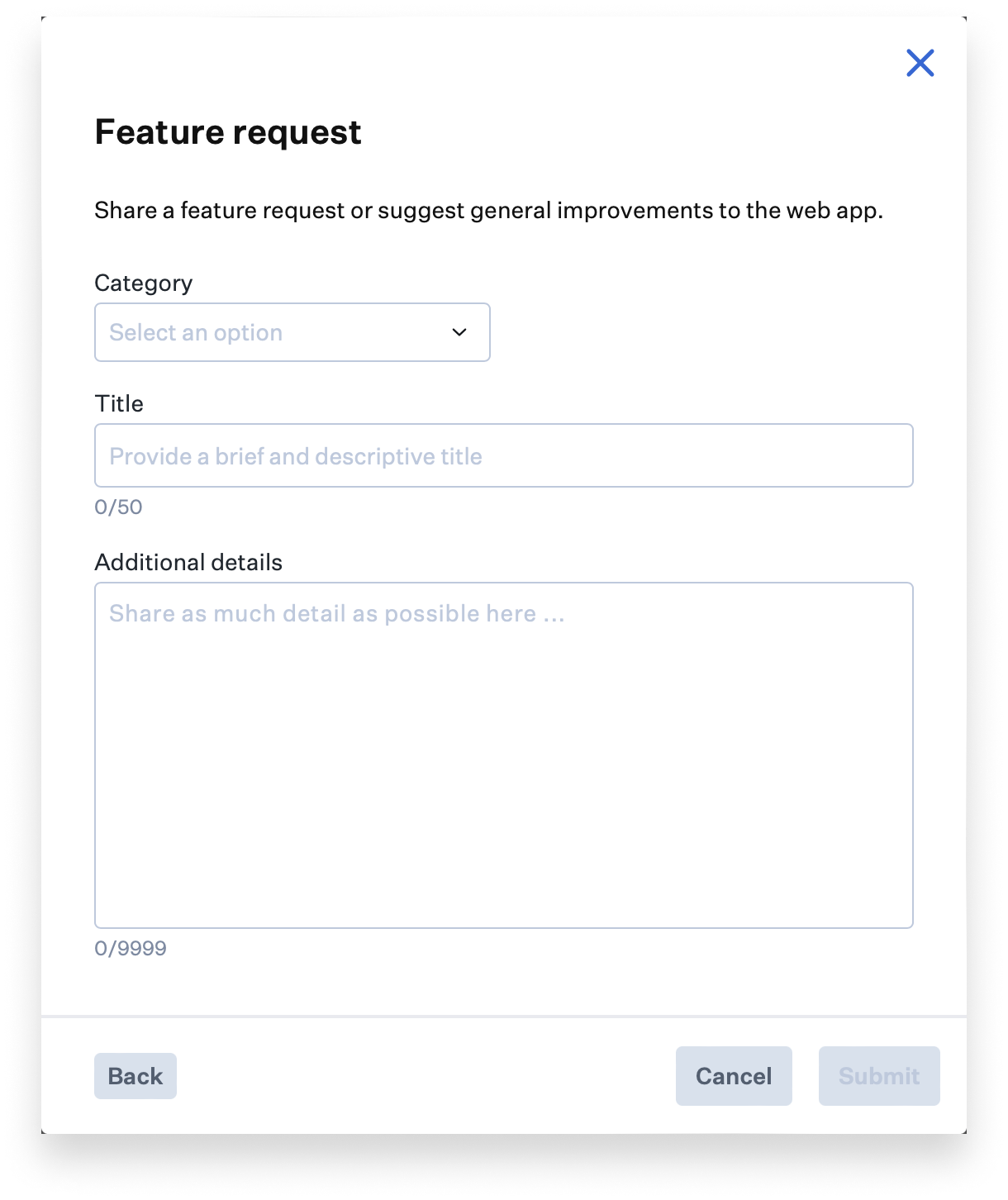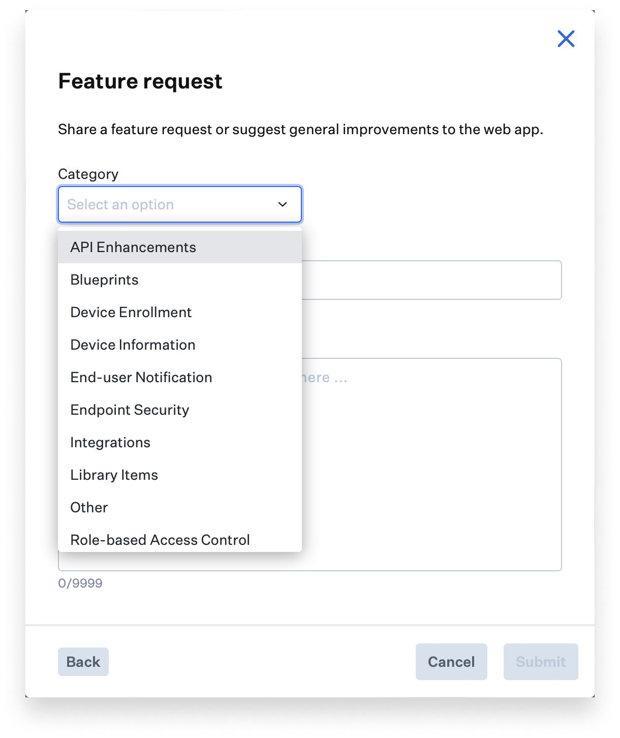 When you select Feature request, Kandji displays new Category and Title fields above the Additional details field.